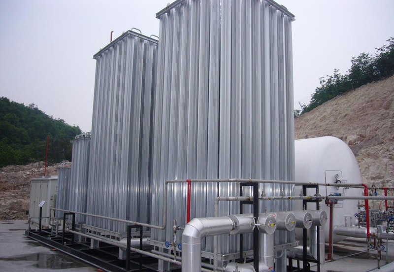 LNG由槽车运至气化站,利用LNG卸车增压器使槽车内压力增高,将槽车内LNG送至LNG低温储罐内储存。当从LNG储罐外排时,先通过储罐的自增压系统,使储罐压力升高,然后打开储罐液相出口阀,通过压力差将储罐内的LNG送至气化器后,经调压、计量、加臭等工序送入市政燃气管网。当室外环境温度较低,空温式气化器出口的天然气温度低于5℃时,需在空温式气化器出口串联水浴式加热器,对气化后的天然气进行加热。